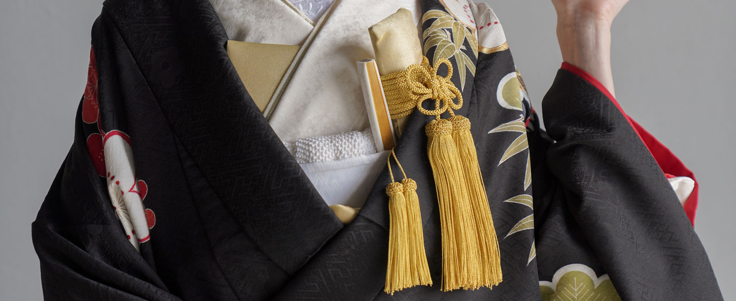 深みのある⿊地に、紅梅と松⽵の吉祥⽂様、そして⾦彩に輝く鶴が悠然と舞う⼀着。静寂をまとったような⿊の美しさの中で、⾚と⾦が凛とした華やぎを放ち、花嫁の所作をいっそう印象的に引き⽴てます。鶴が象徴する⻑寿と夫婦円満の願いを込め、神前式や格式ある結婚式、重厚感のある前撮りにふさわしい、芯のある美を纏う⾊打掛です。